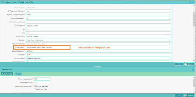 Masuk di halaman Edit Data Peserta Didik, silahkan scrool di kolom Kecamatan. Silahkan isikan kolom Kecamatan Peserta Didik. Jika sudah silahkan klik Simpan.
